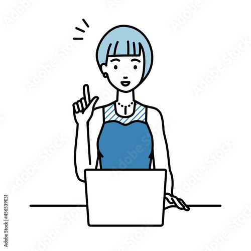 デスクで座ってPCを開いて何かひらめいたドレスの女性