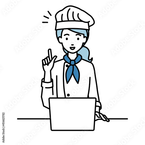 デスクで座ってPCを開いて何かひらめいた調理師の女性