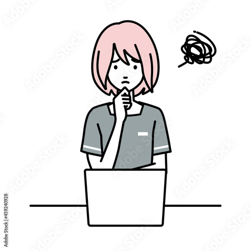 デスクで座ってPCを開いて困っているエステ店員の女性