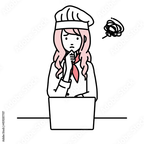 デスクで座ってPCを開いて困っている調理師の女性