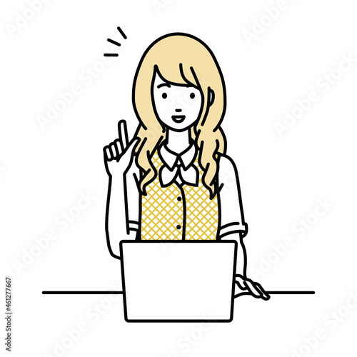 デスクで座ってPCを開いて何かひらめいた事務員制服の女性