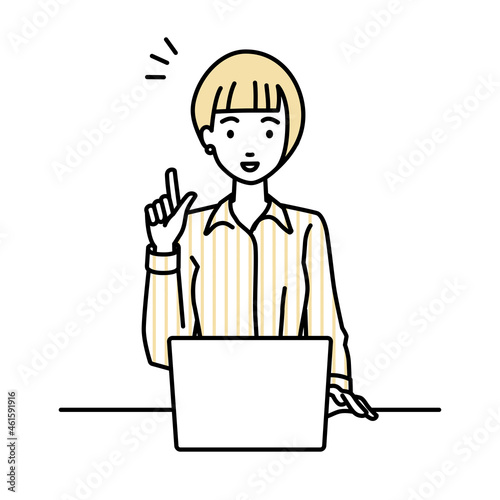 デスクで座ってPCを開いて何かひらめいたブラウスの女性