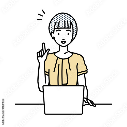 デスクで座ってPCを開いて何かひらめいたオフィスカジュアルの女性