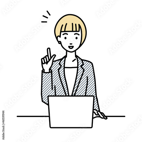 デスクで座ってPCを開いて何かひらめいたジャケットの女性