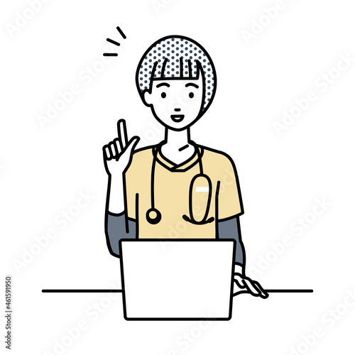 デスクで座ってPCを開いて何かひらめいた看護師の女性