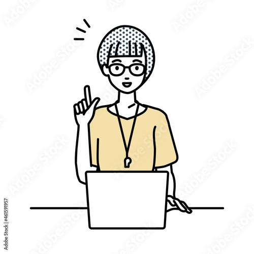 デスクで座ってPCを開いて何かひらめいた教師の女性