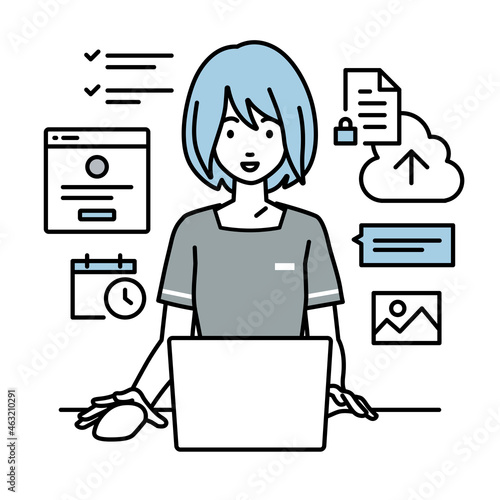 デスクで座ってPCでプロジェクトやタスクの管理の仕事をしているエステ店員の女性