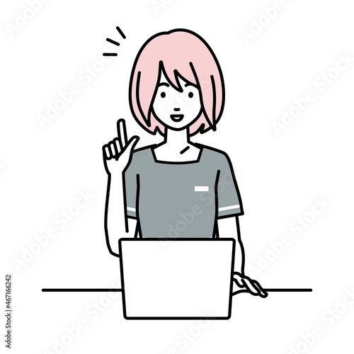 デスクで座ってPCを開いて何かひらめいたエステ店員の女性
