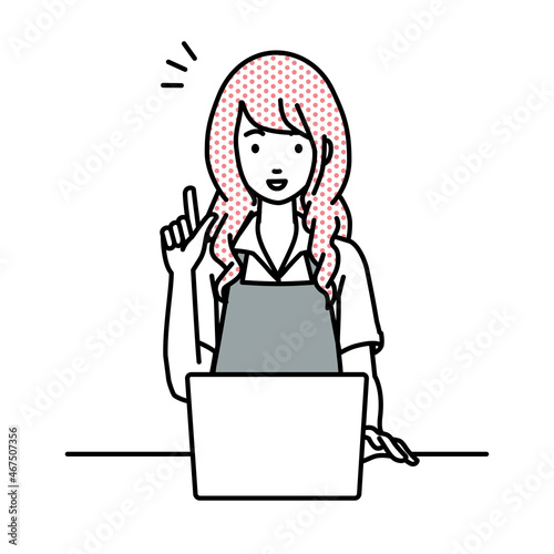デスクで座ってPCを開いて何かひらめいたカフェ店員の女性