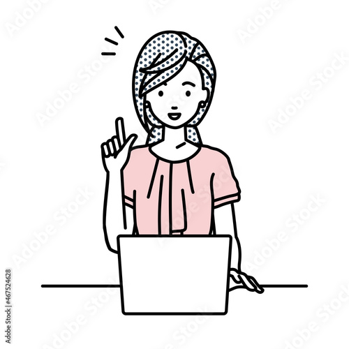 white background, cut-out, illustration, vector, white, flat, business, personal computer, personal computer, notebook, cyberspace, table, desk, work, flair, understanding, aware, point, hint, forefinger, resolution, proposal, work, people, woman, 30s, front, waist up, smile, pink, office, ol, career woman, waist, chiffon