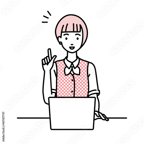 white background, cut-out, illustration, vector, white, flat, business, personal computer, personal computer, notebook, cyberspace, table, desk, work, flair, understanding, aware, point, hint, forefinger, resolution, proposal, work, people, woman, 30s, front, waist up, smile, pink, office, ol, assistant, accounting, uniform, reception, office worker, ribbon, vest