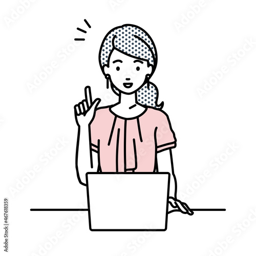 white background, cut-out, illustration, vector, white, flat, business, personal computer, personal computer, notebook, cyberspace, table, desk, work, flair, understanding, aware, point, hint, forefinger, resolution, proposal, work, people, woman, 30s, front, waist up, smile, pink, office, ol, career woman, waist, chiffon