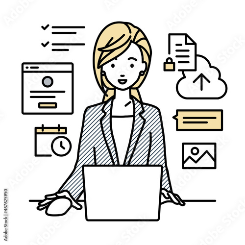 デスクで座ってPCでプロジェクトやタスクの管理の仕事をしているスーツの女性