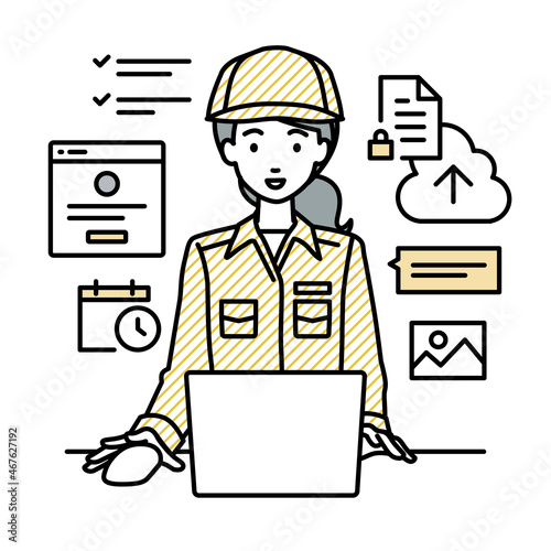 デスクで座ってPCでプロジェクトやタスクの管理の仕事をしている作業員の女性