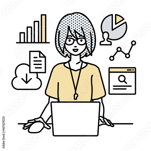 デスクで座ってPCでプロジェクトやタスクの管理の仕事をしている教師の女性