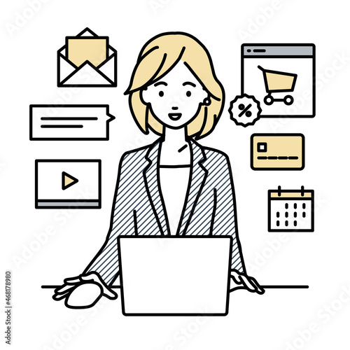 デスクで座ってPCでネットショップやマーケティングの仕事をしているスーツの女性