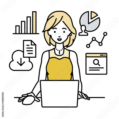 デスクで座ってPCを開いてリサーチしたりデータを分析してレポートにまとめているドレスの女性