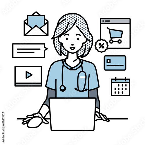 デスクで座ってPCでネットショップやマーケティングの仕事をしている看護師の女性