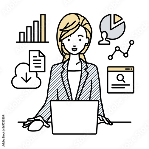 デスクで座ってPCを開いてリサーチしたりデータを分析してレポートにまとめているスーツの女性