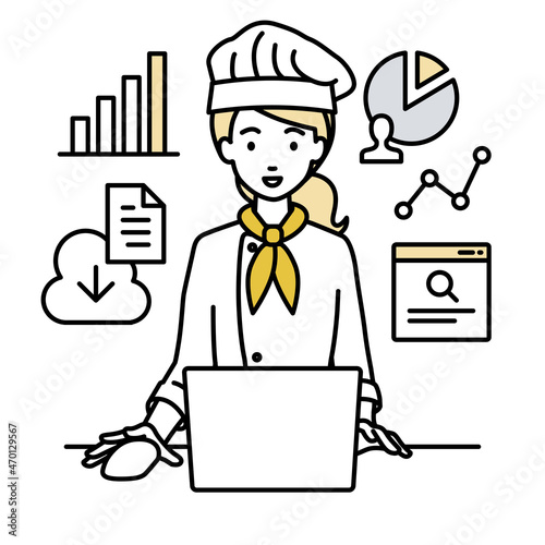 デスクで座ってPCを開いてリサーチしたりデータを分析してレポートにまとめている調理師の女性