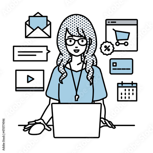 デスクで座ってPCでネットショップやマーケティングの仕事をしている教師の女性