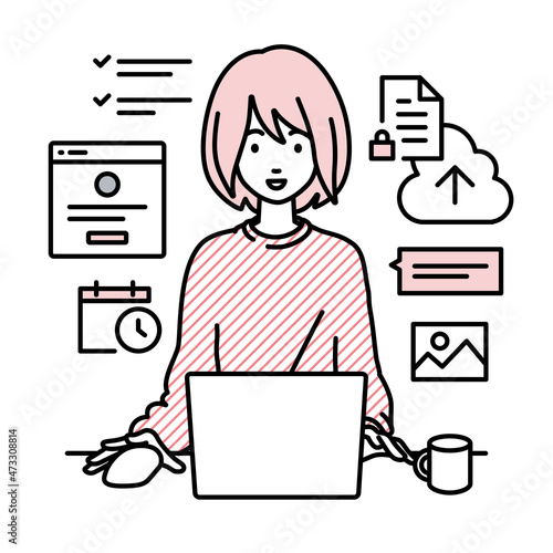 デスクで座ってPCでプロジェクトやタスクの管理の仕事をしているリモートワークの女性