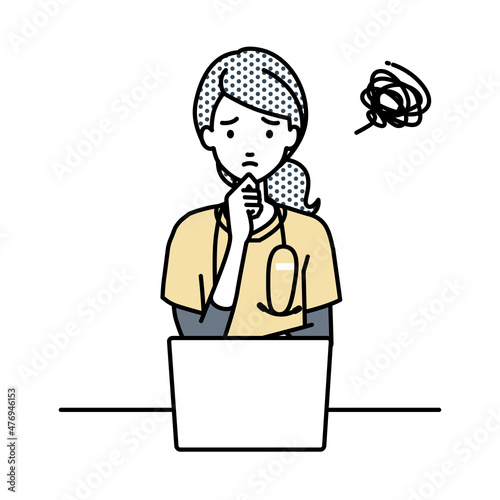 デスクで座ってPCを開いて困っている看護師の女性
