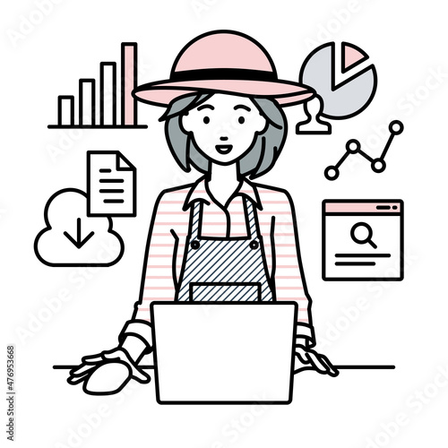 デスクで座ってPCを開いてリサーチしたりデータを分析してレポートにまとめている農家の女性