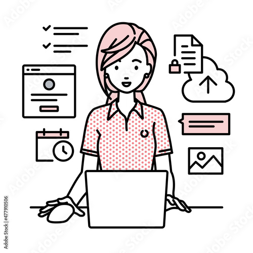 business, personal computer, student, project, schedule, communication, security, upload, file, personal computer, notebook, mouse, desk, work, white background, cut-out, illustration, vector, white, flat, icon, table, web, web, cyberspace, technology, cloud, work, people, woman, smile, front, waist up, pink, team, venture, startup, office, colleague