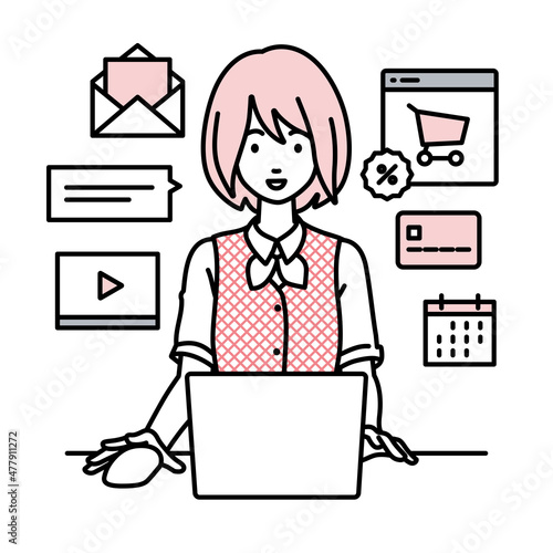 デスクで座ってPCでネットショップやマーケティングの仕事をしている事務員制服の女性