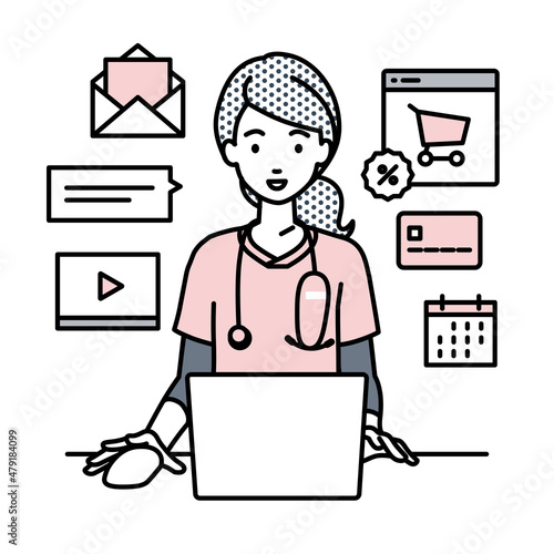 デスクで座ってPCでネットショップやマーケティングの仕事をしている看護師の女性