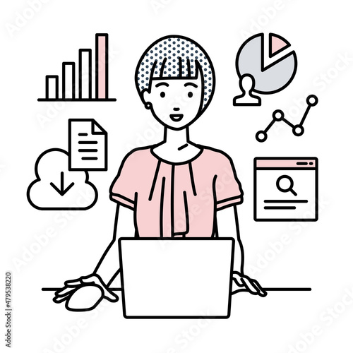 デスクで座ってPCを開いてリサーチしたりデータを分析してレポートにまとめているオフィスカジュアルの女性