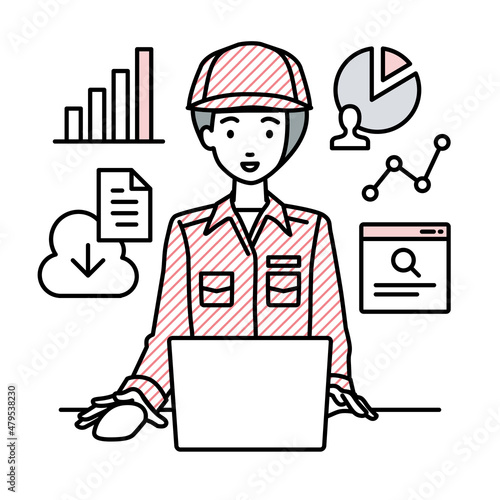 デスクで座ってPCを開いてリサーチしたりデータを分析してレポートにまとめている作業員の女性