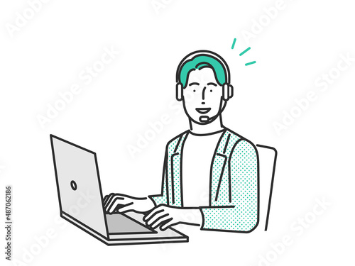 ヘッドセットを装着してPCを操作するビジネスパーソンのイメージイラスト素材