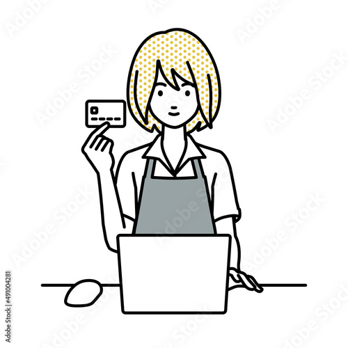 デスクで座ってPCを使いながらクレジットカードを手に持っているカフェ店員の女性