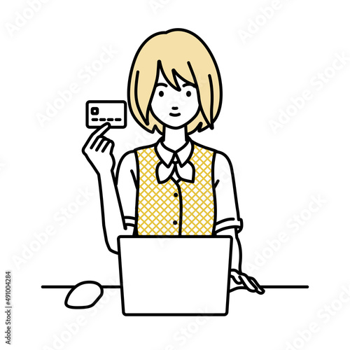 デスクで座ってPCを使いながらクレジットカードを手に持っている事務員制服の女性