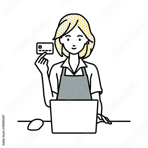 デスクで座ってPCを使いながらクレジットカードを手に持っているカフェ店員の女性