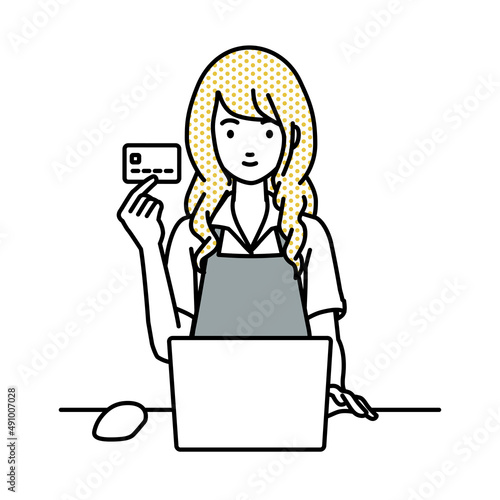 デスクで座ってPCを使いながらクレジットカードを手に持っているカフェ店員の女性