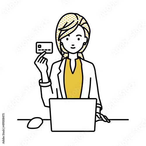 デスクで座ってPCを使いながらクレジットカードを手に持っているジャケットの女性