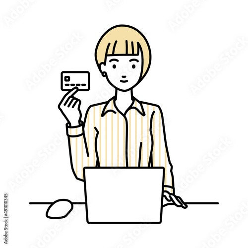 デスクで座ってPCを使いながらクレジットカードを手に持っているブラウスの女性