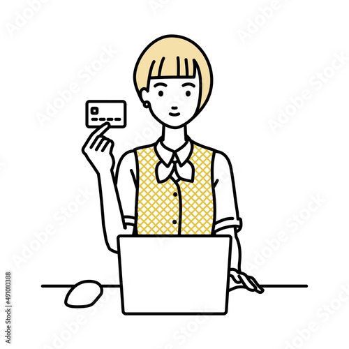 デスクで座ってPCを使いながらクレジットカードを手に持っている事務員制服の女性