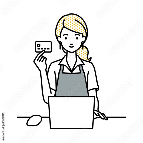 デスクで座ってPCを使いながらクレジットカードを手に持っているカフェ店員の女性