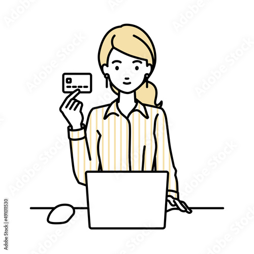 デスクで座ってPCを使いながらクレジットカードを手に持っているブラウスの女性