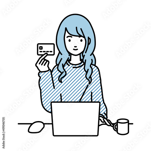 デスクで座ってPCを使いながらクレジットカードを手に持っているリモートワークの女性
