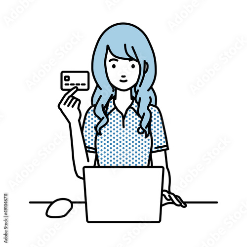デスクで座ってPCを使いながらクレジットカードを手に持っているポロシャツの女性
