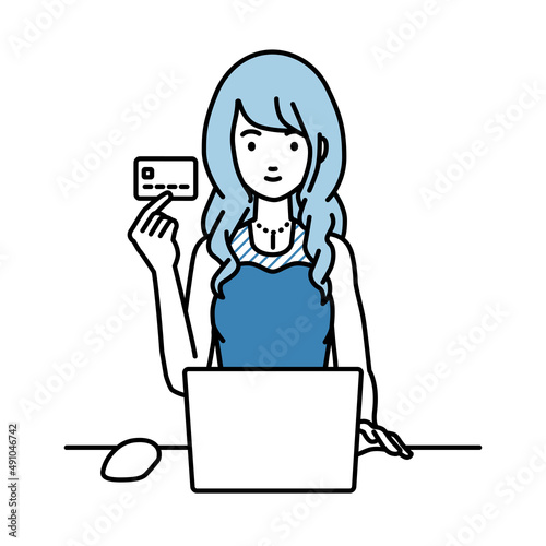 デスクで座ってPCを使いながらクレジットカードを手に持っているドレスの女性
