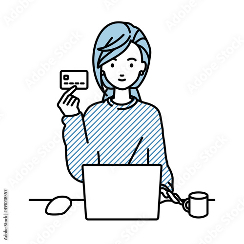 デスクで座ってPCを使いながらクレジットカードを手に持っているリモートワークの女性