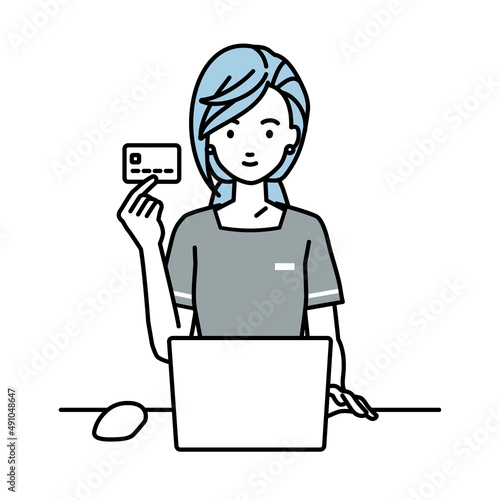 デスクで座ってPCを使いながらクレジットカードを手に持っているエステ店員・受付の女性