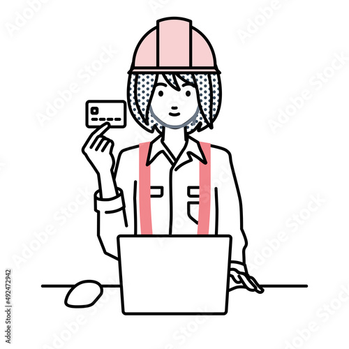 デスクで座ってPCを使いながらクレジットカードを手に持っている工事現場の女性