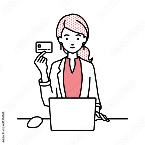 デスクで座ってPCを使いながらクレジットカードを手に持っているジャケットの女性